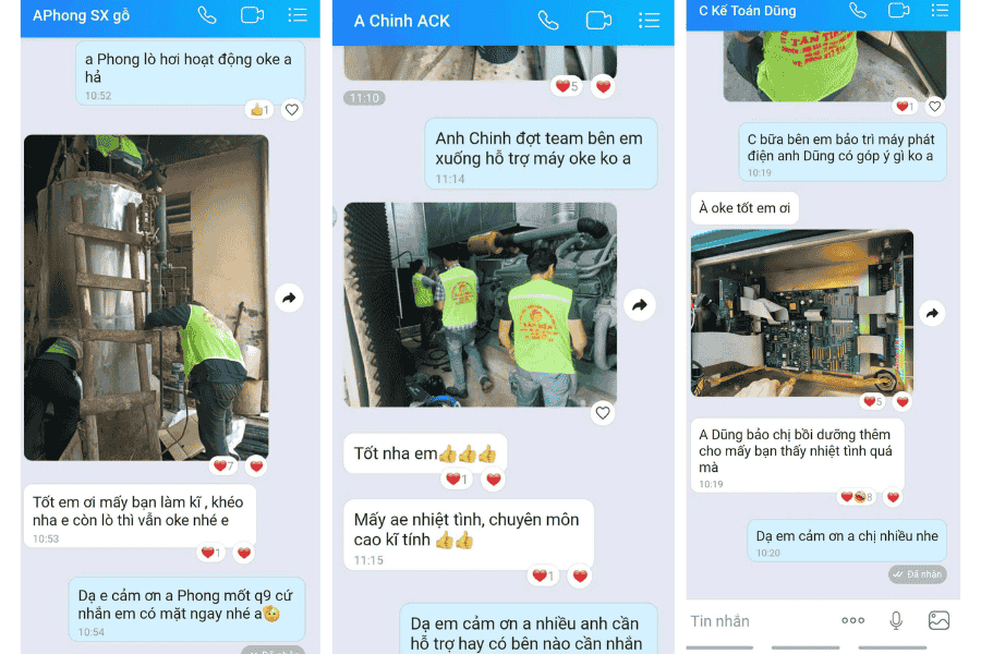 Chị Trần Thị Mai, Quận 1: “Dịch vụ 24/7 của Tân Tiến thật sự ấn tượng. Máy phát điện 50kVA của khách sạn tôi gặp sự cố lúc nửa đêm, đội ngũ kỹ thuật đến ngay và xử lý nhanh gọn.”